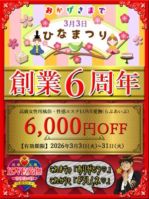 今日からキャンペーンを始めました🎵\ 2026年3月3日♡ひなまつり/おかげさまで創業6周年を迎えることができました!(^^)!女性用風俗店としてオープン日にもこだわり、2020年3月3日(ひなまつり)にオープンした当店LOVE愛撫。オープン当初からの数年は予想だにしないコロナ禍との戦いでもありましたが、これまでに多くのお客様とのご縁に恵まれて、今も営業ができていることに感謝♡感激♡感動の気持ちでいっぱいです。心より御礼申し上げます。そこで、これまでの「ありがとう♡」これからも「よろしくネ♡」の気持ちを込めて当キャンペーンを開催させていただきます。是非、多くのお客様からご用命頂けると幸いです(^_-)-☆